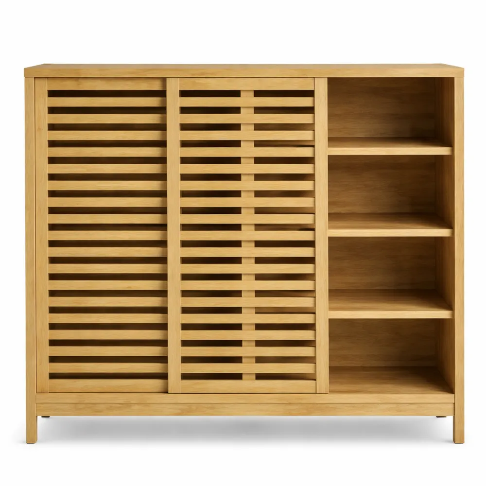 Fabriqué en bambou naturel avec un fini laqué résistant aux rayures, cet espace de rangement est conçu pour durer. Sa surface se nettoie facilement avec un chiffon humide. Ce meuble dispose de portes coulissantes avec des lattes permettant une bonne ventilation. Les pieds surélevés protègent contre les éclaboussures.